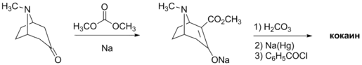 Другой метод синтеза начинается с тропанона, который вводят в реакцию карбоксилирования в присутствии натрия, затем полученную натриевую соль подвергают гидролизу, кетогруппу восстанавливают и бензоилируют. Как и в прошлом случае, левовращающий изомер кокаина выделяют из смеси через диастереомерные соли с бромкамфорсульфокислотой[34].
