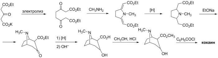 Первый полный синтез кокаина был предложен в 1902 году. Впоследствии методы совершенствовались Робинсоном[32] и Вильштеттером[33], в результате чего были предложены более оптимальные схемы[19][34].