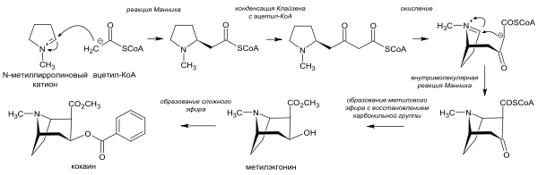 N-Метилпирролиновый катион участвует в реакции Манниха с молекулой ацетилкофермента А (ацетил-КоА). В процессе реакции образуются R- и S-энантиомеры, в образовании кокаина принимает участие только S-энантиомер, подвергающийся конденсации Клайзена с ещё одной молекулой ацетил-КоА. Получившееся соединение окисляется с образованием нового N-метилпирролинового катиона, который снова участвует в реакции Манниха (на этот раз уже внутримолекулярной), благодаря чему образуется тропановый скелет. Метилэкгонин образуется с участием SAM и восстановителя никотинамидадениндинуклеотида (NADH), после чего следует образование сложного эфира с бензоил-КоА[38].