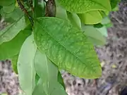 Ветви прямые, листья тонкие, зелёного цвета, по форме овальные, сужающиеся в оконечности.