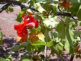 Цветки одиночные, на цветоножках. Чашечка тонкокожистая, покрытая тёмными точками, венчик оранжево-красного цвета. Лепестки венчика отогнутые, до 6 см шириной и длиной 8 см.