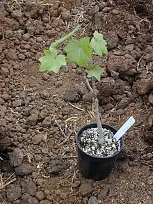 Листья пятираздельные, на длинных черешках, тонкокожистые, бледно-зелёного цвета, с красноватыми точками, снизу волосистые, шириной 9—13 см. К концу периода вегетации листья краснеют.