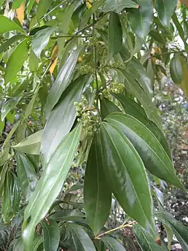 Листья от удлиненно эллиптических до ланцетных, длиной 12—15 см, шириной 4—5 см, с клиновидным основанием, на вершине слегка заострённо-оттянутые, но затем на самом кончике вдруг обрубленно-закруглённые и вновь очень коротко заострённые; жилкование пальчатое, средняя жилка перисторазветвлённая, заканчивается в острие листа, а две боковые, огибающие лист вдоль краев, в верхней трети листа сливаются с разветвлениями средней жилки; пластинка листа кожистая, с обеих сторон голая, блестящая, сверху ярко-зелёная, снизу бледнее. Черешки длиной 1—1,5 см, изогнутые.