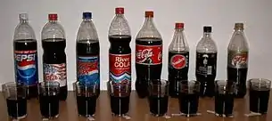 - Напитки типа колы содержат кофеин в незначительном количестве - не более 150 мг/л. Это меньше, чем в чашке эспрессо и чёрного чая[33][34]. Кофеин может вызвать психическую и физическую зависимость, но незначительную[35][36]. Кофеин не угрожает физическому, социальному или экономическому здоровью[35][36].