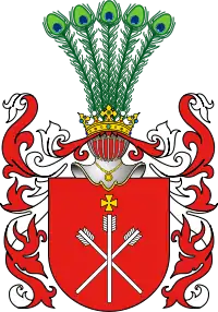В красном поле три серебряных дротика или арбалетных болта, положенные звездообразно, оперением вверх, над ними золотой кавалерский крест.