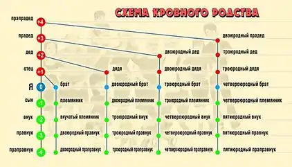 Братья и сёстры приходятся друг другу родственниками в первом колене или родными (достаточно подняться на один уровень вверх по генеалогическому древу, чтобы встретить их предка — общего родителя). Но при этом родные братья и сестры являются родственниками через два колена, так как каждому нужно подняться к общему предку (одно колено) и опуститься к брату или сестре (плюс ещё одно колено). При этом только родители с детьми имеют связь через одно колено. В свою очередь, дети детей приходятся друг другу родственниками во втором уровне колен или «двоюродными» (у них общий прародитель — дед или бабушка), но при этом имеют связь через четыре колена. Дядя и племянник приходятся друг другу родственниками в первом колене или родными, так как поднявшись от дяди на один уровень вверх, мы находим их общего родственника (отца/мать одного и деда/бабушку другого).