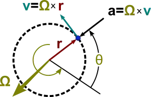 Три показанных соотношения выводятся из геометрии колеса, где длина дуги окружности зависит от заданного угла поворота , выраженного в радианах, умноженного на радиус окружности, при этом при повороте колеса на один оборот оно проходит расстояние равное периметру, что соответствует углу поворота в радианах 2π. Ускорение, вызванное изменением направления скорости, можно найти, если заметить, что скорость совершает полное изменение направления за то же самое время T, за которое объект делает один оборот. Тогда вектор скорости проходит путь длиной 2π v каждые T секунд: