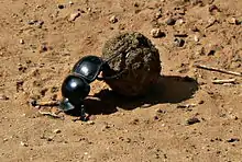 Как ближайший пример (и возможный прототип) колеса, Шольц указывает на жука-навозника, который скатывает экскременты животных в шарик и затем закатывает его в норку. При этом одна пара задних ног придерживает шарик с двух противоположных сторон, образуя аналог оси[25].
