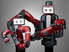 Коллаборативный робот (кобот) — это автоматическое устройство, которое может работать совместно с человеком для создания или производства различных продуктов.[1] Как и промышленные роботы (см. Промышленный робот), коботы состоят из манипулятора и перепрограммируемого устройства управления, которое формирует управляющие воздействия, задающие требуемые движения исполнительных органов манипулятора.[2]