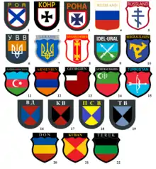 - 1. Русская освободительная армия[1][2]. 2, 5. Комитет освобождения народов России[3][4]. 3. Русская освободительная народная армия (Локотское самоуправление; впоследствии — 29-я добровольческая пехотная дивизия СС «РОНА»)[4][5][6]. 4. Особая дивизия R (дивизия «Руссланд»; впоследствии — 1-я Русская национальная армия)[4]. 6. Украинская освободительная армия[1]. 7. Украинская национальная армия; нарукавный знак был разработан в 1944 году, но, вероятно, не получил практического применения[7][8]. 8. 30-я добровольческая пехотная дивизия СС (1-я белорусская); нарукавный знак был разработан в 1944 году, но, вероятно, не получил практического применения[7][9]. 9. Легион «Идель-Урал»[3]. 10. Горно-кавказский легион (впоследствии разделён на азербайджанский и северокавказский легионы)[3][10]. 11. Азербайджанский легион[3]. 12. Армянский легион[3]. 13. Грузинский легион[3]. 14. Северокавказский легион[3]. 10. Туркестанский легион[1]. 16, 20. Донские казаки[11]. 17, 21. Кубанские казаки[11]. 18. Сибирские казаки[1]. 19, 22. Терские казаки[11].