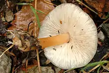 - Гименофор пластинчатый, пластинки приросшие к ножке или почти свободные, часто расположенные, белого цвета, иногда с розоватым или желтоватым оттенком. Иногда выделяется форма luteifolius с жёлтыми пластинками.
