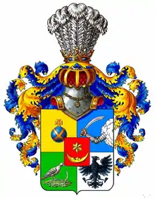 Во второй в голубом поле выходящая из облака рука в серебряных Латах с Саблею. В третьей в зелёном поле, стоящая на земле Птица имеет под ногами серебряного Змия. В четвёртой части в серебряном поле виден чёрный одноглавый Орёл.