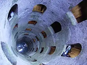 Для доступа к воде были построены два независимых прохода, спускающихся по спирали вдоль стен колодца. Такое решение позволило пустым повозкам спускаться, а наполненным водой — подниматься одновременно, не пересекаясь в пути. Проходы состоят из 248 ступеней и освещаются естественным светом, проникающим через 70 окон[1].