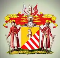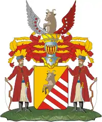 Описание герба: Выдержка из Общего гербовника Щит, разделен справа налево диагональной чертой на две части, имеет верхнюю часть золотую, а нижнюю составленную из девяти серебряных и красного цвета полос; из этой части виден вышедший до половины буйвол. Щит увенчан обыкновенным дворянским шлемом с дворянской на нём короной, и с двумя распростёртыми орлиными крыльями, с правой стороны серебряным, а с левой красным, с изображением на каждом крыле пяти звёзд, на серебре красного цвета, а на красном серебряного, а между крыльев означен вышедший до половины буйвол. Намёт на щите золотой, подложен красным. Щит держат в руках два воина из Золотой орды, имеющие в руках лук и за плечами колчан. |