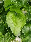 Листья волосистые, снизу более бледные, довольно многочисленные, прикорневые — с красными волосистыми черешками, яйцевидные, острые, длиной 7 см, шириной 4 см, городчатые; стеблевые листья короткочерешковые или сидячие, яйцевидные, острые, двоякогородчатопильчатые.