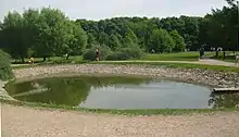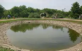 Декоративная копань с забетонированным берегом. Достаточно мелкий. Рыбы нет. Много личинок комаров.[1]