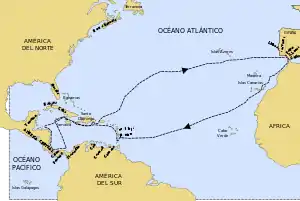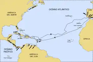 Христофор Колумб отбыл в своё второе путешествие в Америку 24 сентября 1493 года[4]. 3 ноября 1493 года он высадился на острове, который назвал Доминикой, а 22 ноября — на Эспаньоле и провел некоторое время, исследуя остров и его ресурсы. Он оставил Эспаньолу 24 апреля 1494 года и прибыл на остров Хуана (Куба) 30 апреля, а 5 мая — на Ямайку. Колумб исследовал южное побережье Хуаны, прежде чем вернуться на Эспаньолу 20 августа. Пробыв некоторое время на западе острова, он, наконец, вернулся в Испанию.