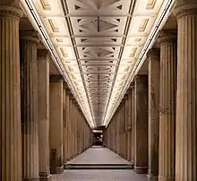 Колоннады, выступающие соединяющим музеи архитектурным мотивом, появились на Музейном острове благодаря королю Фридриху Вильгельму IV. Крытые галереи были возведены перед южным и восточным фасадами Нового музея и по Бодештрассе в 1853—1860 годах по проекту, в основу которого лёг эскиз Фридриха Августа Штюлера 1841 года. Генрих Штрак и Георг Эрбкам обновили штюлеровский проект, и в 1876—1878 годах колоннады появились на набережной Шпрее и за Старой национальной галереей. Особенностью галереи на набережной являются три маленьких напоминающих храмы павильона с плоскими купольными крышами, расположенные по краям и посередине. Скульптуры Колоннадного двора призваны дать представление о коллекции Национальной галереи, то есть искусства XIX века.