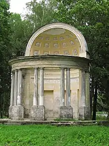 «Мы объезжаем озеро, поворачивая вправо, и через некоторое время подплываем к мраморной ротонде, купол которой срезан наполовину, как анатомический череп[К 1]. Напротив, по ту сторону озера на открытом месте, покрытом дёрном, вы замечаете колонну, увенчанную фигурой орла, установленную в память того, что Орлов выстрелил, как говорят, от этой ротонды в живого орла. Это вымысел здоровых глаз. Верится в это ещё меньше, так как расстояние составляет, несомненно, более 450 шагов»[24].