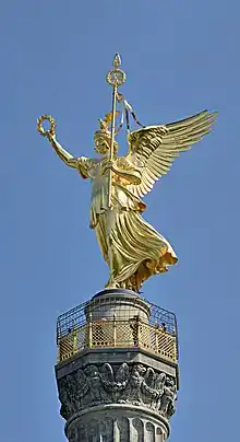 На вершине колонны установлена бронзовая скульптура богини Виктории работы Фридриха Драке. В правой поднятой руке богиня держит лавровый венок, в левой — военный знак с Железным крестом. Её шлем украшен орлиными крыльями. Фридрих Драке придал женскому образу богини Виктории черты кронпринцессы Пруссии Виктории Великобританской[1]. Бронзовая скульптура высотой 8,30 м и весом в 35 тонн была изготовлена в берлинской литейной мастерской Германа Гладенбека. Скульптура трижды реставрировалась в 1954, 1989 и 2011 годах. В Берлине скульптуру на вершине колонны Победы прозвали Золотой Эльзой: в 1866 году в журнале Gartenlaube публиковался пользовавшийся большой популярностью одноимённый роман Евгении Йон.