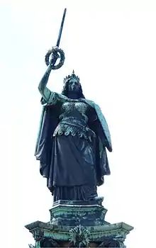 Колонна начинается с прямоугольного основания, на котором висят четыре бронзовые таблички с именами 650 павших воинов и надписью: «Воинам 1870-71 от благодарных мекленбуржцев»[3]. Гранитное основание колонны заканчивается коринфским ордером и 2,60-метровой статуей «Мегаполис», которая является аллегорией государства Мекленбург. Её фигура, увенчанная «Вендской короной», правой рукой поднимает меч с нанизанным на него лавровым венком, а левой рукой держит короткий остроконечный щит, на котором можно рассмотреть голову быка Мекленбурга.
