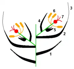 - верхняя цветковая чешуя, или палеа (лат. palea) — чешуя, которая, согласно разным теориям, либо образуется при срастании двух листочков наружного круга простого околоцветника покровного цветка, либо является прицветным листом беспокровного цветка;