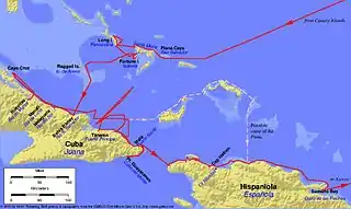 - 24 апреля 1494 года — оставив в Ла-Изабелле гарнизон под командой младшего брата Диего, Колумб повёл три небольших корабля на запад вдоль юго-восточного побережья Кубы.