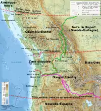 В 1825 году Компания Гудзонова залива основала на берегу Колумбии Форт-Ванкувер, который располагался на месте современного города Ванкувер, штат Вашингтон. Форт был основан как штаб-квартира округа Колумбия, охватившего значительную территорию к западу от Скалистых гор. Компания Гудзонова залива переориентировала направления своей деятельности к Тихому океану через реку Колумбия, которая стала основным водным путём региона[73]. В начале 1840-х годов регион начали заселять американцы через Орегонскую тропу, хотя Компания Гудзонова залива препятствовала появлению здесь американских поселений. Многие переселенцы на заключительном этапе своего путешествия спускались по реке Колумбия до форта Ванкувер[74]. Этот участок от Те-Далс до Форт-Ванкувер был наиболее коварной частью пути, что способствовало строительству (1846) Дороги Барлоу[75].