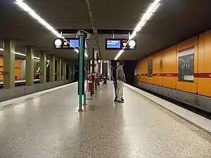 . Стены станции облицованы округленными оранжевыми цементо-волокнистыми плитами. Колонны отделаны зелёным кафелем. Пол выложен бетонными блоками в мотиве гальки Изара, потолки облицованы алюминиевыми панелями с тремя рядами ламп. Имеет по два выхода на обеих концах платформ с общими подземными вестибюлями. Примерно на высоте человеческого роста по всей путевой стене проходит красная полоса. В 1987 году на обеих платформах, в южной их части, были установлены лифты, которые идут непосредственно на улицу[2].