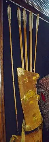 Такой способ ношения стрел не годился для конного лучника, так как стрелы портились при тряске от скачки, их было трудно доставать для стрельбы на скаку. Поэтому у тюркских народов был позаимствован колчан — плоский кожаный футляр с дополнительными рёбрами или перегородками внутри, предотвращавшими перетряхивание стрел при скачке.