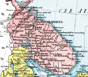 | Уездный город | Кола (1708-1859, 1883-1899), Александровск (1899-1917, 1917-1921 (де-юре)), Мурманск (1917-1921 (де-факто)) |