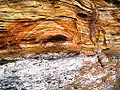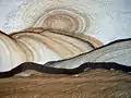 Очень похожие образования возникают в слоистой структуре тонкопористых пород при процессах выветривания. Таковы, например, ритмические кольца, полосы, гиперболы, окрашенные бурыми гидроксидами железа, в известняках, мелкозернистых песчаниках и других породах.