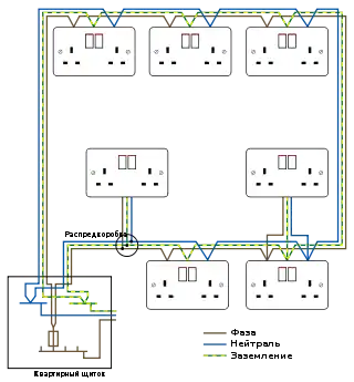- Радиальная проводка с нарушенным соединением не будет функционировать (если повреждена фаза или нейтраль) или будет функционировать без защитного заземления (если повреждён заземляющий провод).