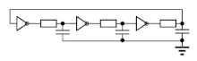 Простейший генератор (Фиг. 2) может быть построен соединением в кольцо трёх инверторов. Подобная схема стартует сразу после подачи питания и генерирует сигнал с частотой 1/6Td, где Td — задержка распространения сигнала через одиночный инвертор. В «чистом» виде подобный генератор обладает сильной зависимостью частоты от питающего напряжения и температуры, а также от свойств транзисторов из которых построены цифровые инверторы. Это свойство, однако, применяется в интегральных микросхемах для контроля параметров процесса. Небольшой тестовый блок состоящий из типичных (библиотечных) элементов, как инвертора, И-НЕ, ИЛИ-НЕ элементов объединенных в кольцевые генераторы, генерирует набор сигналов, измерение частоты которых даёт информацию о задержках каждого из элементов для данного процесса, напряжения питания и температуры.