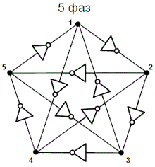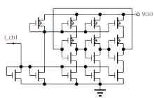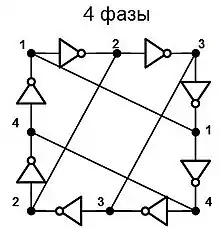 Ограничение тока через инвертор с помощью пары токовых зеркал (Фиг. 3) позволяет управлять задержкой распространения сигнала, и соответственно частотой кольцевого генератора. В таком виде кольцевой генератор может быть использован в качестве элемента ФАПЧ (PLL). Каждый из составляющих кольцевой генератор инверторов может быть дополнен RC-цепочкой. В этом случае (Фиг. 4) задержка на элемент будет в меньшей степени определяться самим инвертером, и в большей степени задержкой RC-цепи. Это позволяет получить генератор с частотой гораздо в меньшей степени зависящей от параметров транзисторов, напряжения питания и температуры. Простейший 3х-элементный кольцевой генератор (Фиг. 2) имеет на выходе 3 сигнала сдвинутых по фазе на 120 градусов. Используя 5, 7 и более каскадов можно получить произвольное количество фаз, однако стоит избегать числа каскадов не равного простому числу, например 9 или 15. Проблема состоит в том, что в генераторе состоящем из, например 9и элементов могут возникать как колебания с частотой 1/18Td, так и колебания с частотой 1/6Td. То есть по кольцу будут распространяться группы сигналов в виде трёх логических единиц, и трёх «нулей». Часто возникающая задача получения тактовых импульсов со сдвигом в 90 и 180 градусов может быть решена объединением трёхэлементных кольцевых генераторов в более сложную структуру (Фиг. 5). Такая схема генерирует две пары комплементарных сигналов сдвинутых на 90 градусов. Существуют структуры, состоящие из инверторов, для генерации восьми и более фаз. Иногда требуется получение нечётного количества фаз, но простая схема из, к примеру, 5и инверторов имеет суммарную задержку не позволяющую получить сигнал требуемой частоты. В этом случае возможно построение пяти-фазного кольцевого генератора из нескольких трёхэлементных (Фиг. 6).