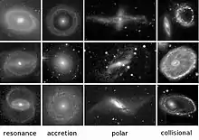 Другая гипотеза образования колец — аккреция вещества карликовых галактик-спутников. Этот процесс сходен с дисковой аккрецией в тесных двойных звёздах. Этот механизм является основным при образовании галактик с полярным кольцом[5].