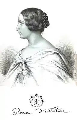в 1855 году выступила на литературном поприще с книгой «La vie monastique dans l'Eglise orientale» (которая потом неоднократно переиздавалась). Писала на французском под псевдонимом Графиня Дора Д’Истриа (Comtesse Dora d'Istria )[6].