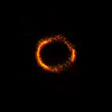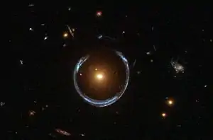 Кольцо Эйнштейна, также кольцо Эйнштейна — Хвольсона — изображение какого-либо источника света (галактика, звезда и т. п.), искажённое до кольцеобразной формы под действием более близкого объекта очень большой массы (например, другой галактики или чёрной дыры) в результате гравитационного линзирования[1][2]. Явление возникает, когда источник излучения, объект-линза и наблюдатель находятся на одной прямой.