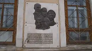 На этой площади 3 июня 1918 года белогвардейцами были зверски убиты пламенные борцы за советскую власть: Д. В. Колющенко, В. И. Могильников, Н. П. Тряскин, М. А. Болейко, Ш. К. Гозиосский. Вечная слава героям революции!