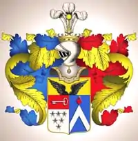 В золотой вершине щита изображены два чёрных орлиных распростёртых крыла. В нижней пространной части, в правом красном поле горизонтально положен серебряный ключ и под ним в серебряном поле шесть комаров, означенные 3, 2 и 1; а в левом голубом поле, на серебряном стропиле находится сердце с пламенем. Щит увенчан дворянскими шлемом и короною с оной страусовыми перьями, на коих золотая шестиугольная звезда. Намёт на щите золотой, подложенный голубым и красным.