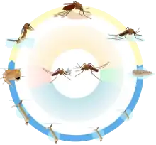 В течение жизненного цикла комар проходит изменения или Метаморфоз на разных стадиях жизненного цикла, и меняет среду обитания.