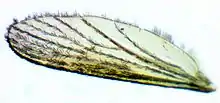 Среднеспинка покрыта, как правило, красновато-бурыми чешуйками; боковые края среднеспинки и более или менее значительное пространство перед щитком покрыто более светлыми чешуйками; бочки груди бурые с незначительной величины пятнами белых чешуек; проэпимеры без чешуек. Брюшко в тёмно-бурых чешуйках, по переднему краю тергитов, с более или менее широкими перевязями светло-жёлтых чешуек; в редких случаях перевязи могут отсутствовать. Гипопигий: предвершинная бороздка первого сегмента вальв несёт довольно широкую, на вершине закруглённую пластинку; второй отдел мезозомы в виде узкого крючка. Ноги бурые в бурых чешуйках, бёдра снизу покрыты желтовато-белыми чешуйками. Крылья по жилками в тёмно-бурых чешуйках[3]. Наружный покров грудки состоит из коричневых щиток, щитки же состоят из золотисто коричневых щетинок[10]. Светлые поперечные перевязи или светлые боковые пятна расположены по переднему краю тергитов. Проэпистерны покрыты светлыми узкими чешуйками[8]. Скутеллум (scutellum) с узкими золотыми щетинками и коричневыми щетинками в углублениях. Плевра с маленькими почти белыми щетинками. Крылья 3,5—4 мм длиной с узкими чёрными щетками.[10] Самец в отличие от самки имеет пушистые усики.[11]