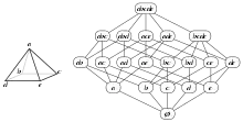 Ключевым методом комбинаторики многогранников является рассмотрение ƒ-вектора многогранника[2] — вектора (f0, f1, …, fd − 1), где fi является числом i-мерных граней многогранника. Например, куб имеет восемь вершин, двенадцать рёбер и шесть граней (фасок), так что его ƒ-вектор равен (8,12,6). Двойственный многогранник имеет ƒ-вектор с тем же числами в обратном порядке. Так, например, правильный октаэдр, двойственный кубу, имеет ƒ-вектор (6,12,8). Расширенный ƒ-вектор образуется добавлением единиц к обоим концам ƒ-вектора, что соответствует перечислению объектов всех уровней решётки граней: f−1 = 1 отражает пустое множество в качестве грани, в то время как fd = 1 отражает сам P. Для куба расширенный ƒ-вектор — это (1,8,12,6,1), а для октаэдра — (1,6,12,8,1). Хотя вектора этих примеров унимодальны (элементы слева направо сначала возрастают, а затем убывают), существуют многогранники более высоких размерностей, для которых это неверно[3].