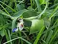 Чашечка из трёх зеленоватых, почти перепончатых яйцевидных чашелистиков, из которых два боковых — более крупные и срастаются между собой у основания. Венчик 10—15 мм в диаметре, два боковых лепестка более крупные, синие, с почти округлой пластинкой и довольно длинным ноготком, а средний — мелкий, яйцевидно-ланцетный, бледно-голубой и коротконоготковый. Из шести тычинок три видоизменены в стаминодии. Завязь с тремя гнёздами, из которых одно — обычно стерильное. Столбик загнут на конце.