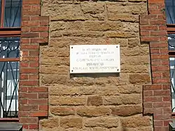 1909 г. 28 июня в пятнадцатое лето Царствования Государя Императора Николая Второго в ознаменования дня 27 июня посвященного памяти Преобразования России Императора Петра Великого, на развалинах крепости Ям-Город, положено основание здания Ямбургского коммерческого училища Ямбургского общества „Просвещения“, сооружаемого по плану гражданского инженера К. К. Васильева».