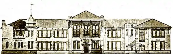 Здание построено из местного плитняка с кирпичными вставками, обрамляющими окна, фасад украшают порталы в духе коллегиальной готики; угловая башенка со шлемовидным куполом решена в стиле модерн[7].