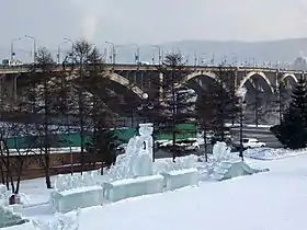 В настоящее время мост ограничен площадями: Предмостной — на правом берегу Енисея и Театральной — на левом берегу.