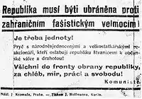 На VII съезде КПЧ (1936) главной задачей партии была названа борьба против фашизма, защита демократии и республики от гитлеровской агрессии, укрепление союза Чехословакии и СССР, заложенного в 1935 году советско-чехословацким договором о взаимной помощи. Была выдвинута программа создания единого Народного фронта.