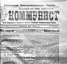 Газета «Коммунист», орган Астраханского губернского комитета Российской коммунистической партии. Страница номера от 26 марта 1919 года