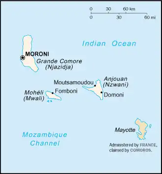 Комо́ры (фр. Comores, араб. جزر القمر, ком. Komori), официальное название — Сою́з Комо́рских Острово́в[8] (фр. Union des Comores, араб. الاتحاد القمري, ком. Udzima wa Komori). В русском языке традиционно используется название Комо́рские Острова́ (до 1978 года — Коморское государство, до 2002 года — Федеративная Исламская Республика Коморские Острова) — государство в Восточной Африке. Расположено в Индийском океане в северной части Мозамбикского пролива между северным Мадагаскаром и северным Мозамбиком. Площадь — 1862 км² (с островом Майотта — 2235 км²[3]). Население — 846 281 человек (2020, без учёта Майотты[4], с ней — более 1 050 000 человек[9]), главным образом народ коморцы или анталоатра. Столица — город Морони.